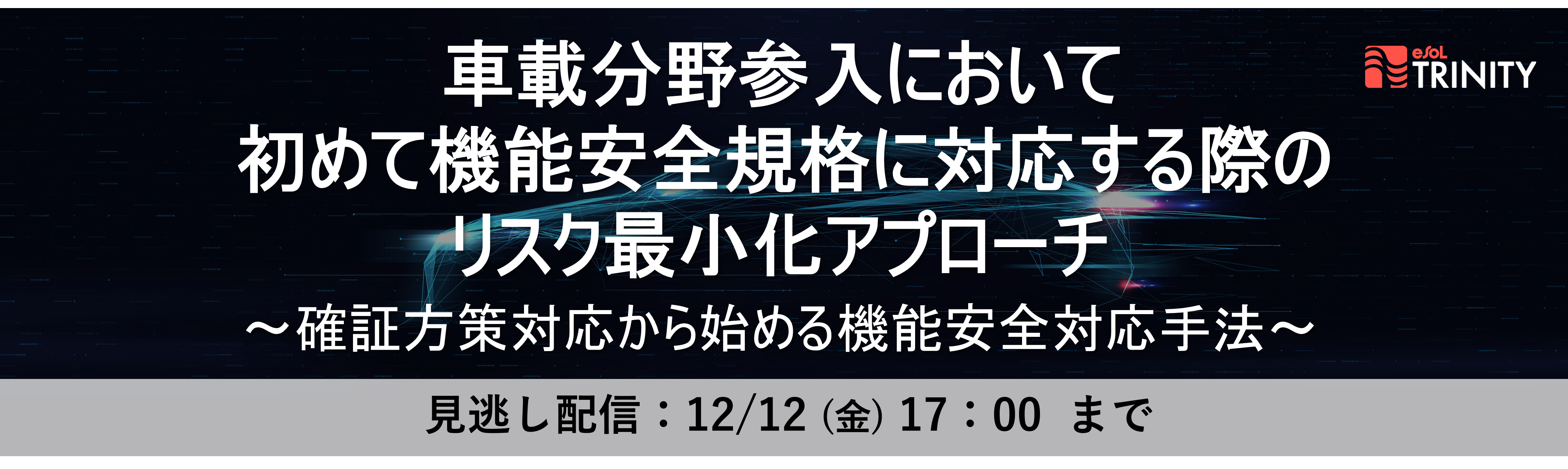 【見逃し案内】12/12(金)まで:車載分野参入において初めて機能安全規格に対応する際のリスク最小化アプローチ