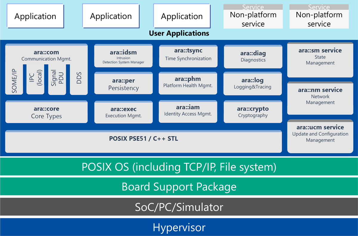 次世代車両のハイパフォーマンスコンピューティング時代に向けたAUTOSAR Adaptive Platform仕様に準拠したソフトウェアプラットフォームです。シングルコアからマルチコア/メニーコアまで対応可能なPOSIX準拠リアルタイムOSを採用し、各種SoCに対応が可能です。通信、ファイルシステム、セキュリティ、診断など各種機能の提供でお客様のシステム開発を支えます。
