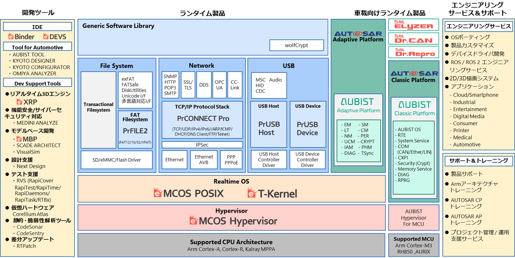 基幹製品であるリアルタイムOSのeMCOS®とハイパーバイザプラットフォームであるeMCOS Hypervisor®は、最新のマルチカーネルアーキテクチャをベースとしており、オープン規格のPOSIXとAUTOSARに準拠したインターフェイスを備えています。ヘテロジニアスなマルチコアやメニーコアのマイクロプロセッサで最適なパフォーマンスとスケーラビリティを実現し、シングルコアのMCUやFPGAにも対応しています。