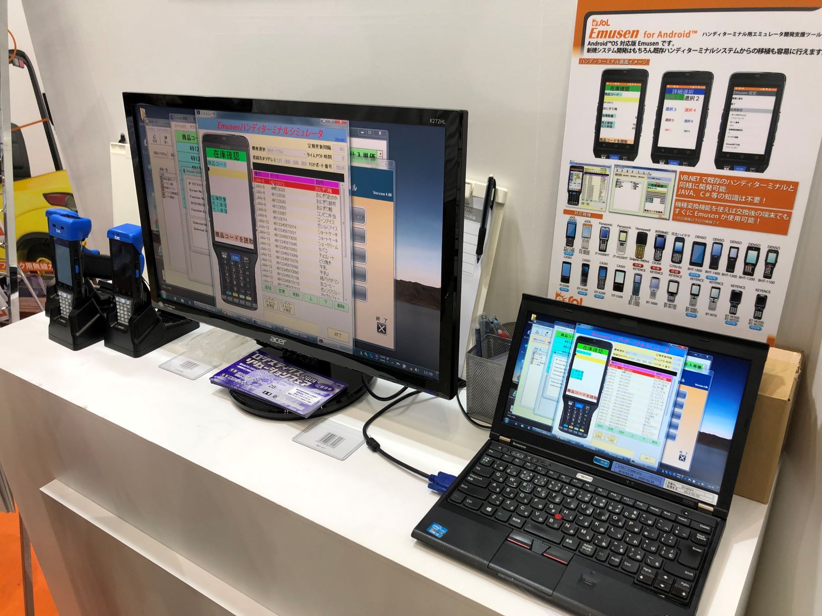 イーソルブースでは、正確性および業務効率向上をサポートするタブレットPCやハンディターミナルなどの端末を活用したフォークリフトソリューションを、実物のフォークリフトに取り付けて展示・紹介しました。これまで培ってきたイーソルの耐環境技術により屋外の環境に対応、汎用タブレットやモニタリングカメラ、センサなどを、フォークリフト運用時の激しい揺れから守り、低コストで搭載できるようになります。さらに、耐環境ハンディターミナルやAndroid搭載端末向けアプリケーション開発支援ツールも展示しました。