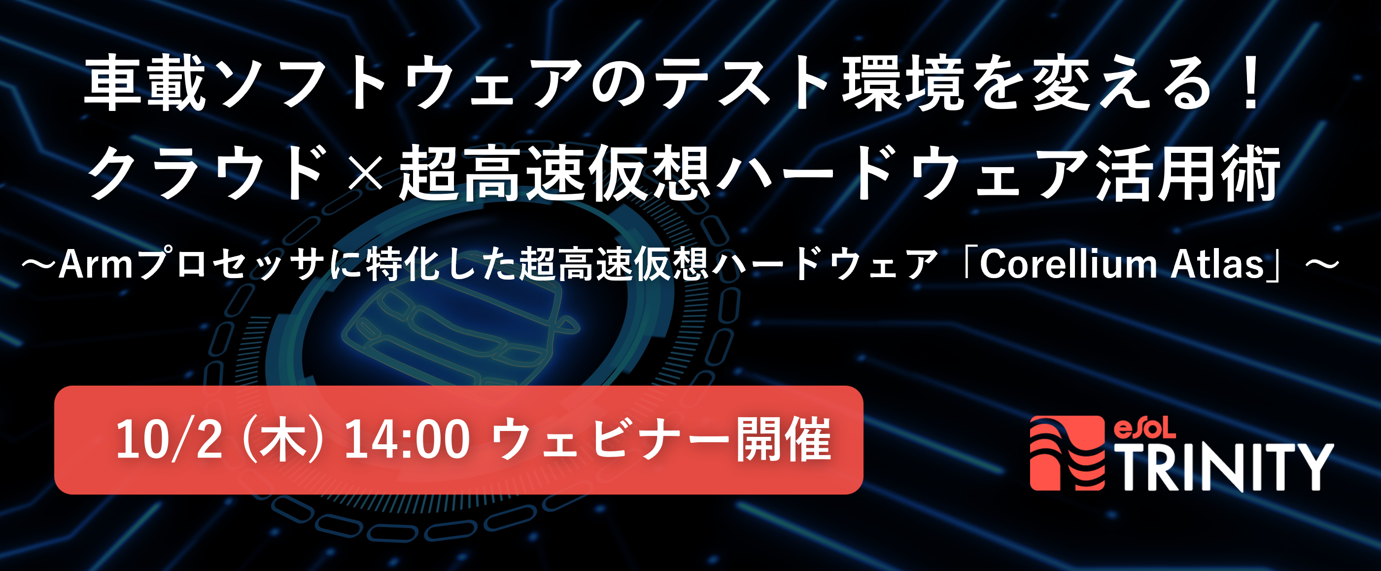 2025.09.19 お知らせ 10/2(木)開催ウェビナー:車載ソフトウェアのテスト環境を変える!クラウド×超高速仮想ハードウェア活用術 ~Armプロセッサに特化した超高速仮想ハードウェア「Corellium Atlas」~ 超高速仮想ハードウェアを活用した車載ソフトウェアテストをテーマに、10/2(木)14時からウェビナーを開催します。 本ウェビナーでは、IVI(車載インフォテイメントシステム)を実現する超高速仮想ハードウェア「Corellium Atlas」の概要と、クラウドネイティブな環境での車載ソフトウェアテストへの活用について解説します。 車載ソフトウェアテストの効率化と品質向上のヒントになるウェビナーです。ぜひご参加ください。 ■ 概要 日時 10月2日(木)14:00〜15:00 対象者 車載ソフトウェアテストの効率化と品質向上に課題を感じている方 参加 無料 詳細 詳細はこちら