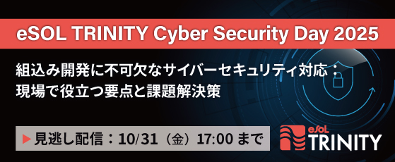 2025.10.21 お知らせ 【見逃し案内】10/31(金)まで:eSOL TRINITY Cyber Security Day 2025 ~組込み開発に不可欠なサイバーセキュリティ対応:現場で役立つ要点と課題解決策~ サイバーセキュリティ対応をテーマにウェビナーを開催しました。本ウェビナーでは、組込み開発におけるサイバーセキュリティ対応に必要となる知見や製品を持つ、SGSジャパン社とシティリバース社をゲストに迎え、サイバーセキュリティ対応におけるポイントや課題解決策について解説しました。現在、見逃し配信として10/31(金)までオンデマンド公開しています。 ■ 概要 公開期間 2025年10月31日(金) 17:00まで 対象者 サイバーセキュリティ対応における要点を押さえたい方や、課題をお持ちの方 参加 無料 詳細 詳細はこちら