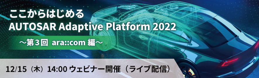 AUTOSAR Adaptive Platform をテーマとしたウェビナーを、Zoomを使ったライブ形式で開催します。本ウェビナーは7月26日に開催した「AUTOSAR Adaptive Platform2022~第1回 入門編~」および 9月29日に開催した「AUTOSAR Adaptive Platform2022~第2回 Hello Adaptive World編~」の続編で第3回目になります。