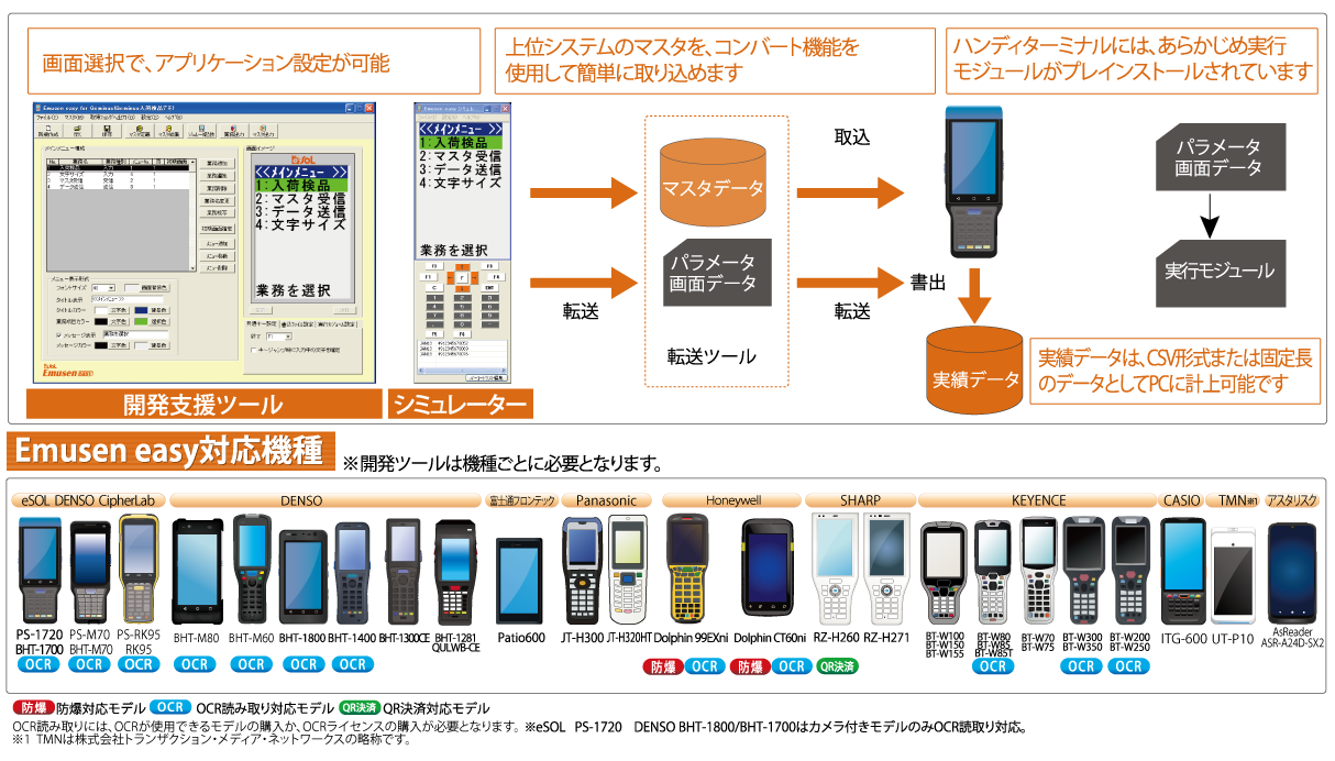 eSOL Emusen™ easy(イムゼンイージー)は、プログラミング不要で、簡単にハンディターミナルのアプリケーションを作成できます。